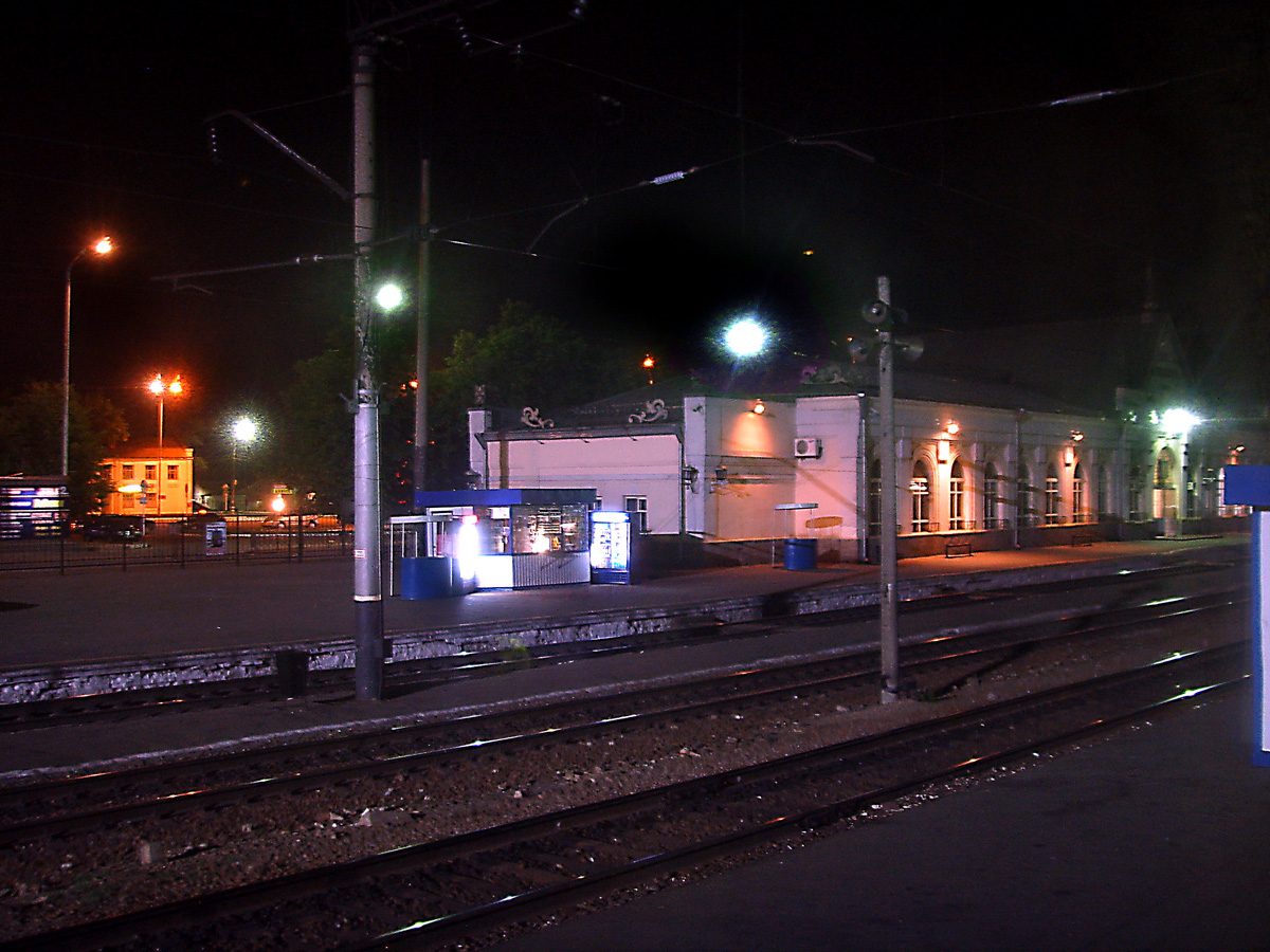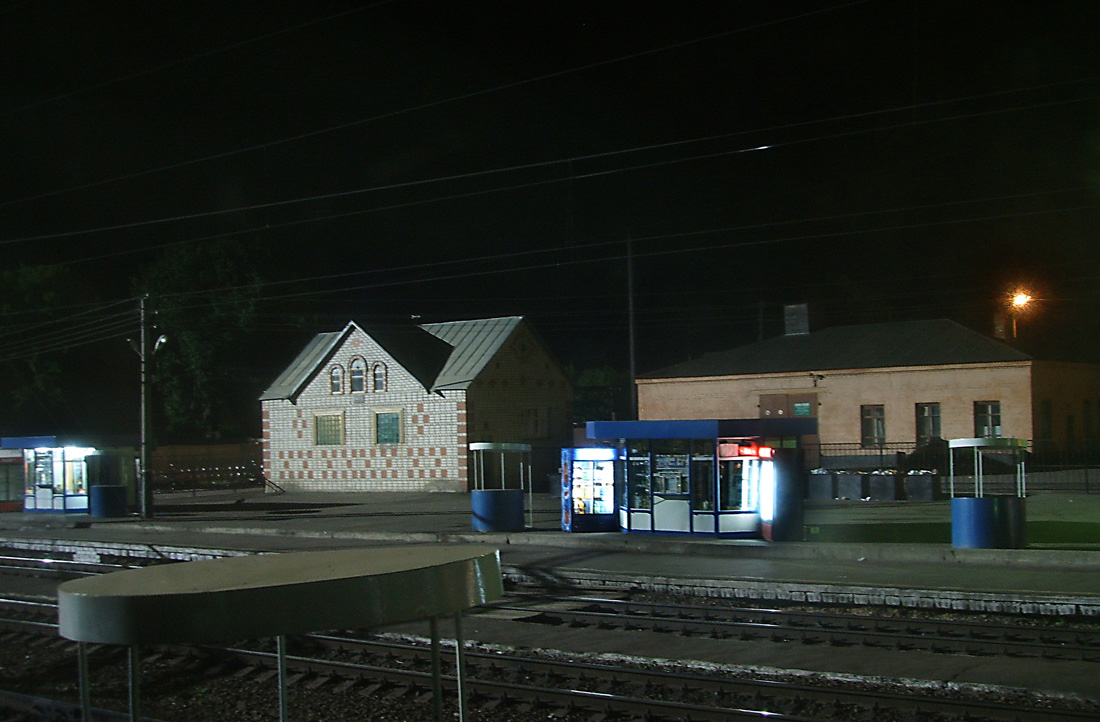 Виды на ночную станцию Россошь. Район пассажирского вокзала. Первая платформа, продуктовые ларьки, заведение «М» и «Ж».