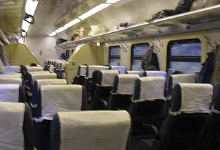 Внутри сидячего вагона. Производства вагонмаш (СПБ). Вагон модели 61-5323 |